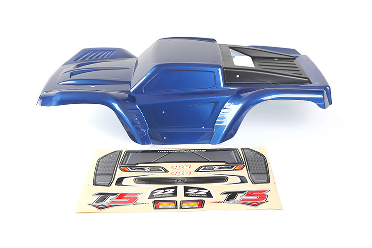 Deze complete gespoten body shell voor de Rovan / Rofun T5 1:5 off-road truck biedt een duurzame en visueel sterke carrosserie met een blauwe of zwarte lakafwerking. De body wordt geleverd met een bijpassend stickerpakket, zodat je truck direct een professionele uitstraling krijgt zonder zelf te hoeven spuiten.